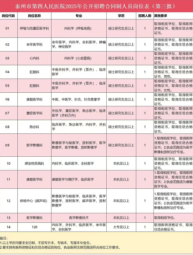 本次面向社会公开招聘 14 人,各招聘岗位、人数和相关要求详见《泰州市第四人民医院 2025 年公开招聘合同制人员岗位表(第三批)》(附件,以下简称《岗位表》)。