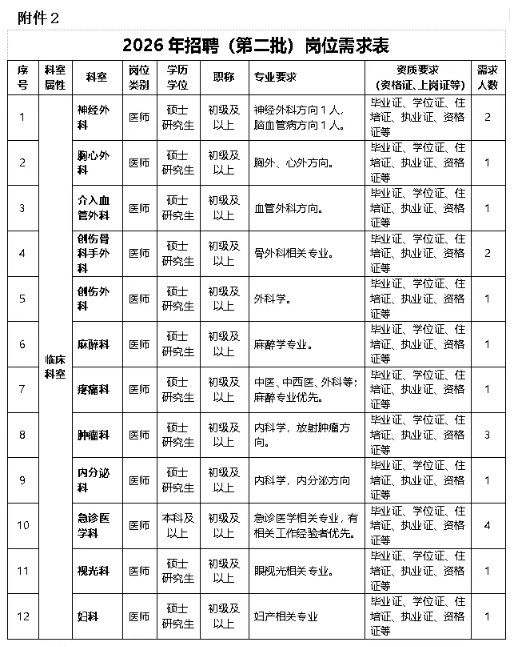 2026 年招聘(第二批),招聘医师岗位 19 名,详情请看「2026 年招聘(第二批)岗位需求表」(附件 2)。岗位如下: