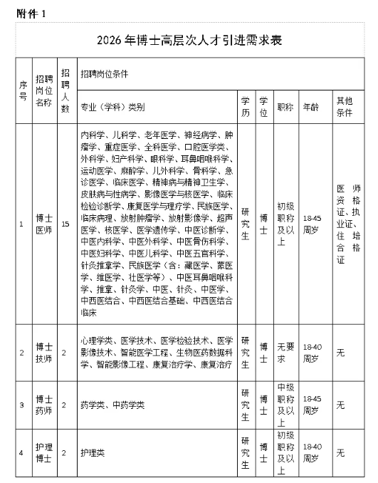1.2026 年博士高层次人才引进需求表