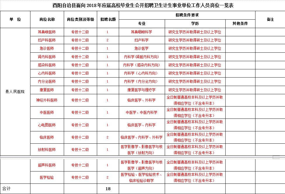 本次面向2018年应届全日制普通高等院校本科及以上毕业生公开招聘卫生计生事业单位工作人员73名,具体岗位及条件详见《酉阳自治县面向2018年应届高校毕业生公开招聘卫生计生事业单位工作人员岗位一览表》(附件1-2,以下简称《岗位一览表》)。