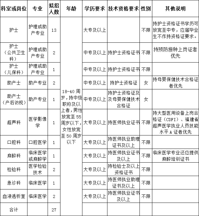 晋江市东石中心卫生院 2018 年公开招聘编外人员计划及要求一览表