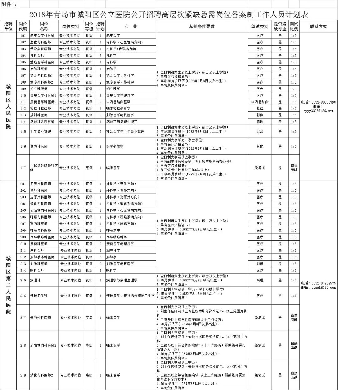 1.2018年青岛市城阳区公立医院公开招聘高层次紧缺急需岗位备案制工作人员计划表