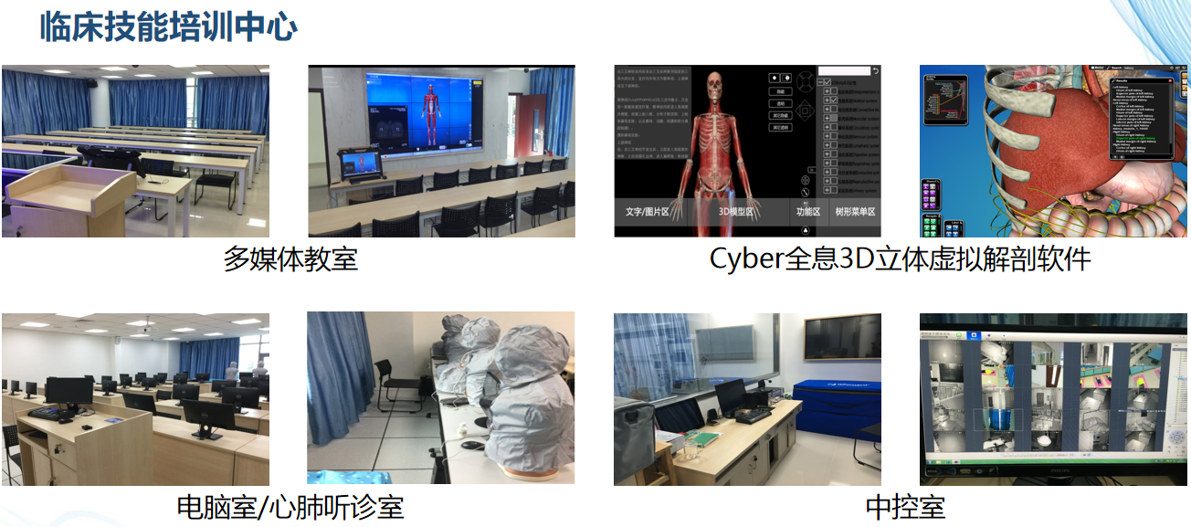 临床技能培训中心地面积为 1399 平方米,与国际先进医学教育模式接轨,临床技能中心独立设置内、外、妇、产、儿、急救、重症、护理八大技能训练室。中心搭建多个实践教学平台,包括基础技能培训平台、解剖影像平台、常见病综合实践平台、专科培训平台(如介入、达芬奇手术机器人以及腹腔镜手术操作等)、常规急救技能培训平台、临床技能考试中心、临床实践基地、平台中引进高端模拟、虚拟情景模拟教学设备,仿真多种临床技能及临床思维练习,以便进行临床综合技能训练;使用网络教学设备,建立网络共享平台,利用网上的临床技能教学资源库进行共享学习,以达到提高实践技能的教学效果,培养临床医生的动手能力、合作能力和创新能力,提高临床技能教学质量。