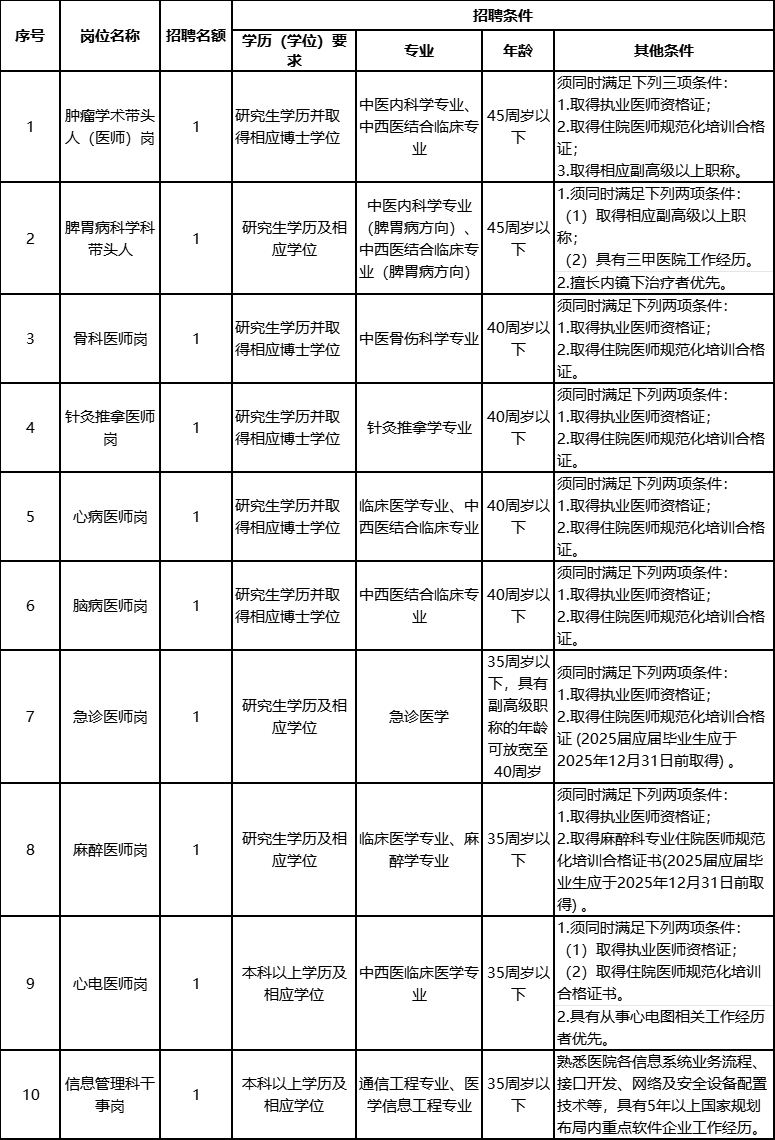 重庆中医药学院附属江津医院(重庆市江津区中医院)因业务发展需要,面向社会公开招聘学科带头人 2 名,医师岗、信息管理科干事岗等 8 名非在编工作人员。