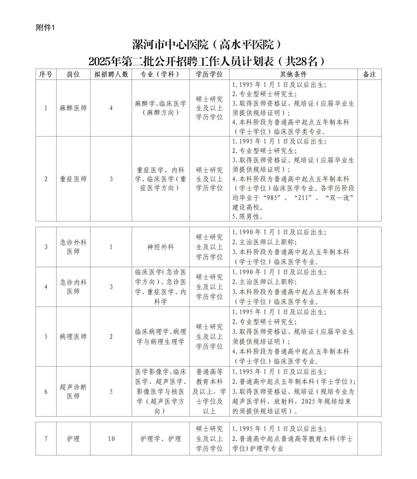 根据《事业单位人事管理条例》(国务院第652号令)、《河南省事业单位公开招聘工作规程》(豫人社〔2015〕55号)、《漯河市机关事业单位补充人员管理办法》(漯编〔2017〕3号)等有关规定和要求,结合医院实际,现将2025年第二批公开招聘工作人员相关事宜公告如下: