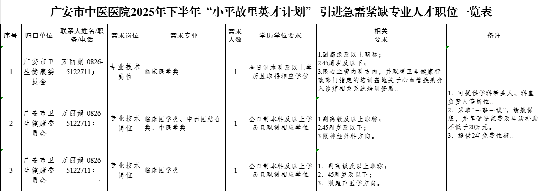1. 网络报名:每位报名者根据《广安市中医医院 2025 年下半年「小平故里英才计划」引进急需紧缺专业人才职位一览表》,选择与自己条件相符的招录职位。报名者须如实填写《广安市 2025 年下半年「小平故里英才计划」引进急需紧缺专业人才报名登记表》,并将填写好的报名登记表(2 寸免冠彩色近照扫描至报名登记表)以 word 文档形式(文件命名为:姓名+应聘岗位)发送至邮箱。