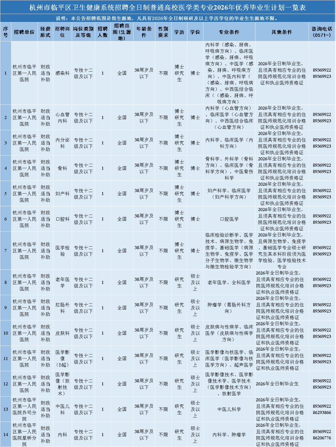 《杭州市临平区第一人民医院医共体招聘 2026 年普通高校医学类专业应届毕业生计划一览表》(点击查看大图)
