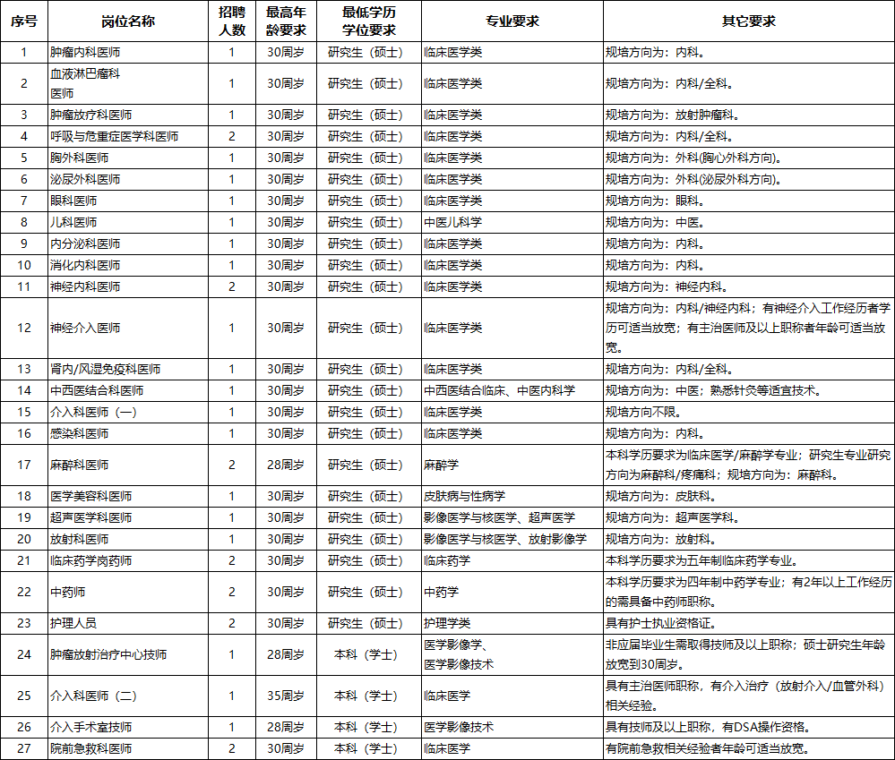 备注:医师岗位到岗时需毕业证、学位证、执业医师证和岗位要求的对应专业住院医师规范化培训合格证明。