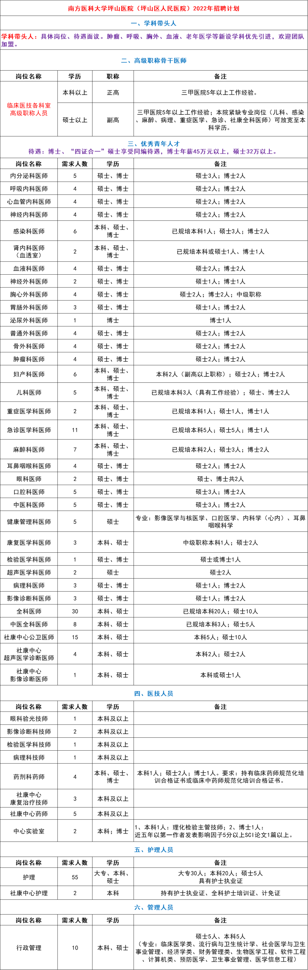 基本要求:50 周岁以下的硕士学历学位高级职称人员,具有三甲医院 5 年以上工作经历或本院紧缺专业岗位(感染科、儿科、麻醉科、病理科、重症医学科、急诊科、社康全科医师)可放宽至全日制本科学历。