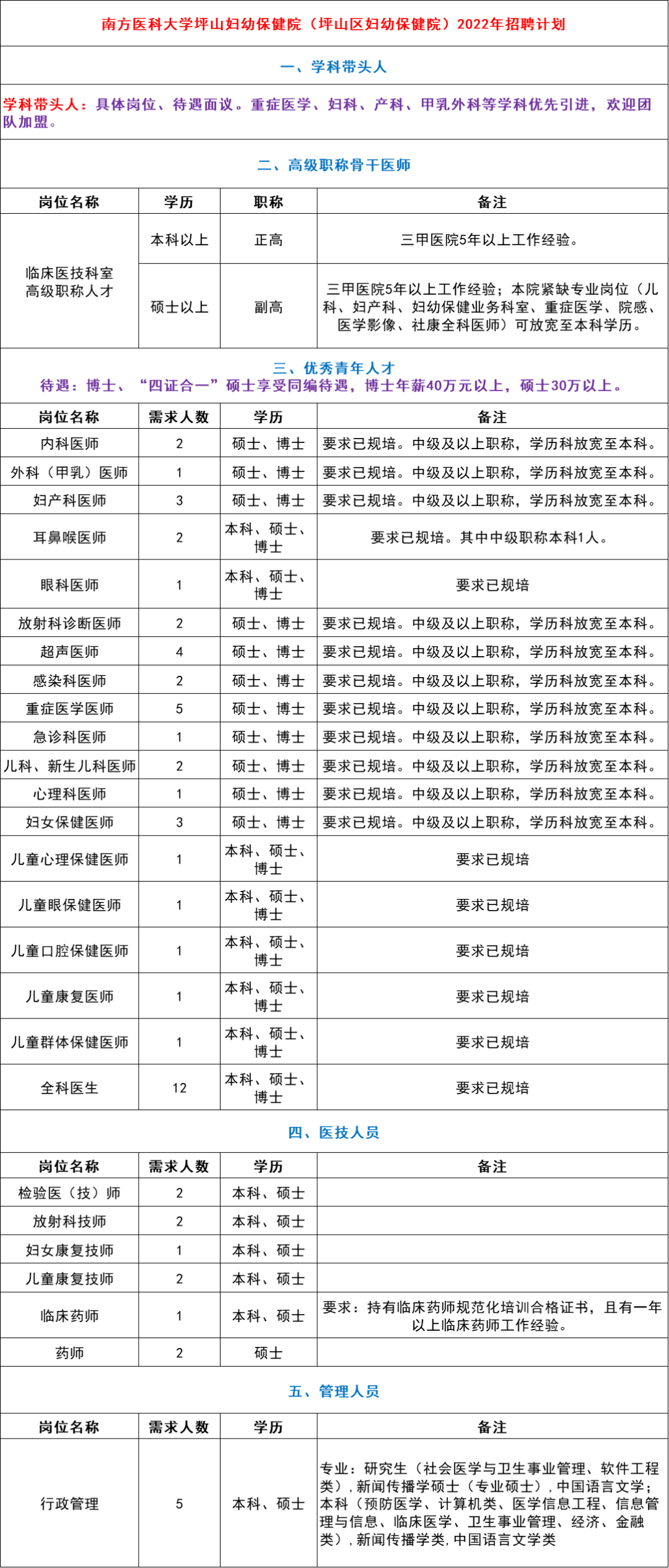坪山区人民医院招聘计划表