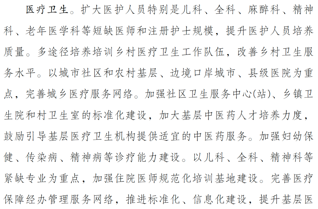儿科等紧缺学科的医护人员培养、基层医疗机构的完善、中医药的服务推广等这些既往文件关注的话题再次得到强调。