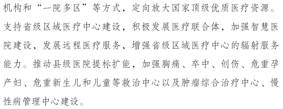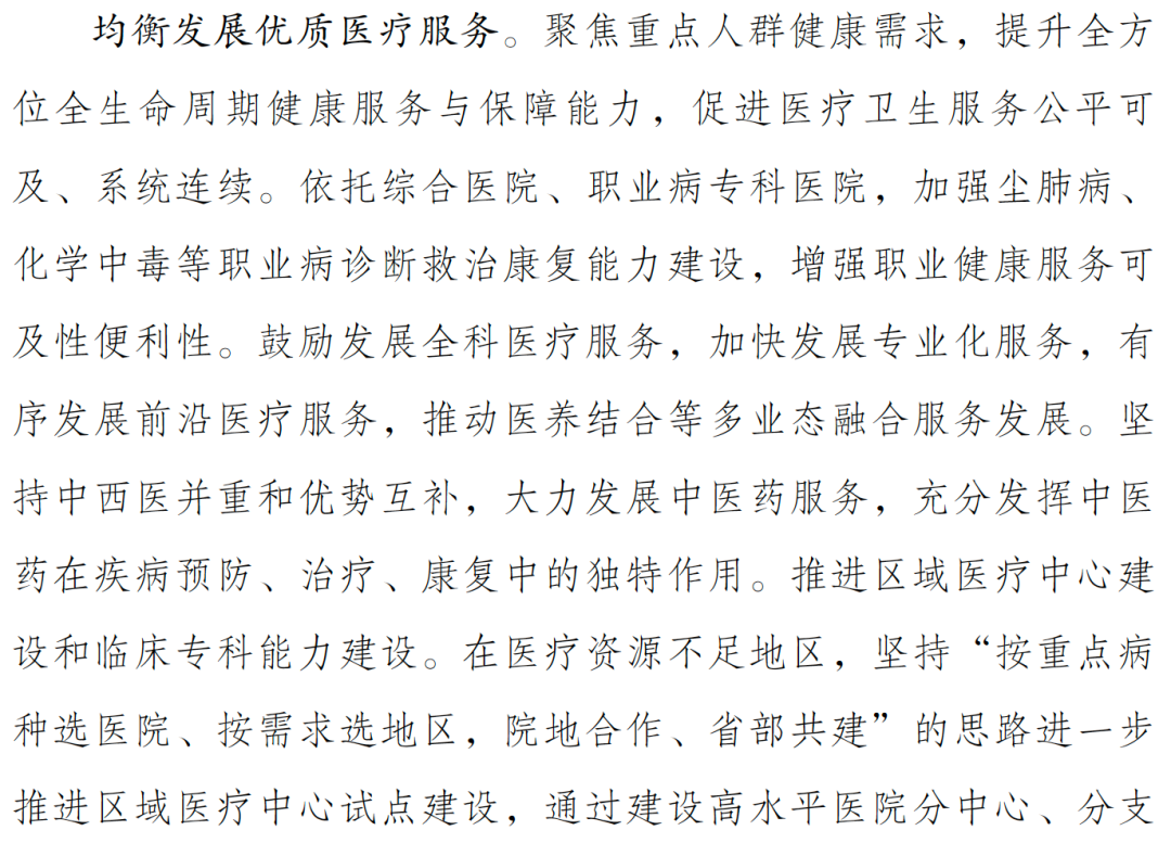 如:职业病的诊疗康复、中西医并重和中医的大力发展、区域医疗中心建设、一院多区、医联体和重点疾病诊疗中心建设等,以期促进医疗卫生服务公平可及、系统连续。