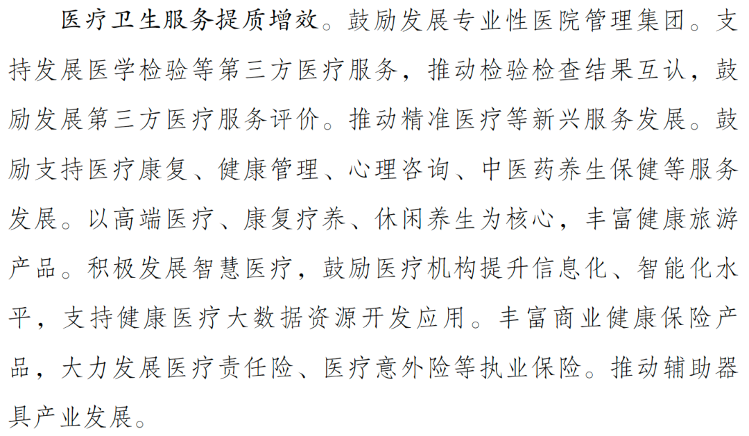 具体到医疗层面主要包括:第三方医疗服务的发展、精准医疗、高端康养、智慧医疗和商业执业保险等。