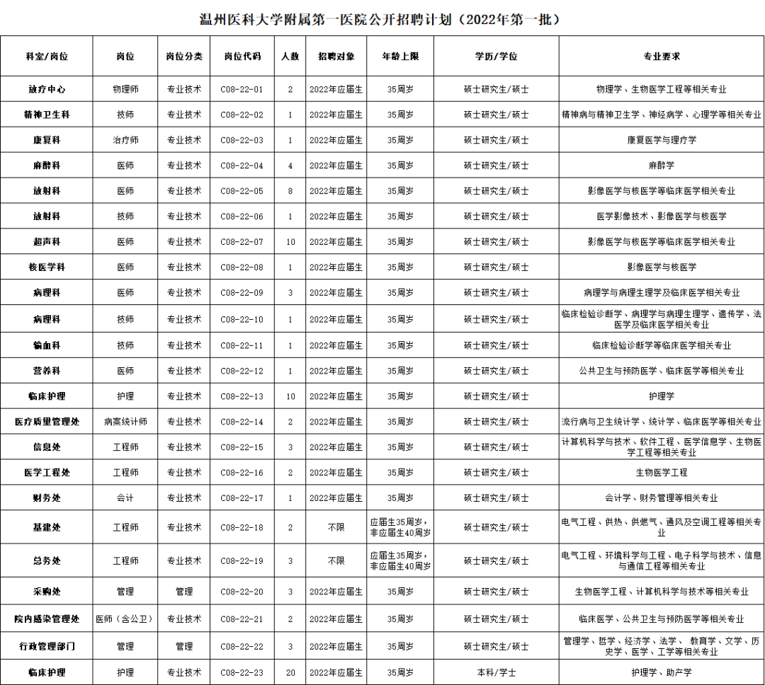 >> 温州医科大学附属第一医院招聘岗位及要求