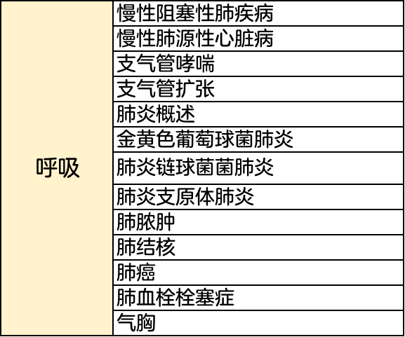这些章节占据了呼吸系统大部分分值,并且考点相对集中,可以视为必拿分部分,把「每年必考疾病」复习透彻 ,呼吸系统可以很好的掌握。