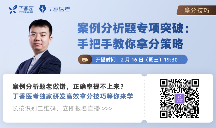 丁香医考专门针对考生的这个问题,做了一场围绕 「案例分析题」的专项突破的 免费 直播讲解 , 手把手教你案例分析题解题思路和拿分技巧。