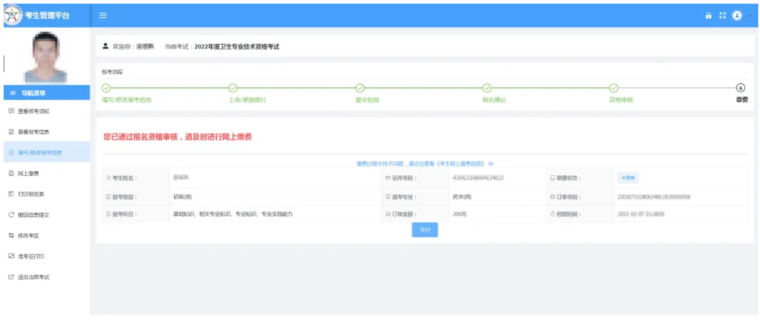 缴费的考生需要登入网上报名系统,点击报考流程上的「缴费」节点或左侧【网上缴费】,完成缴费以后,「缴费」这个节点会变为绿色。