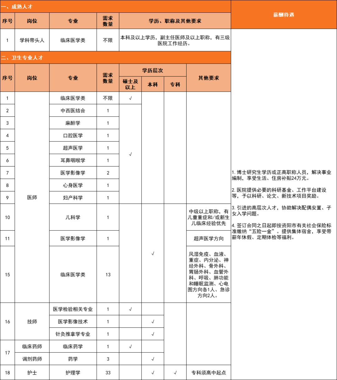 2018 年作为资阳市第一个薪酬制度改革试点的公立医院,薪酬改革实施了向临床一线、高风险、高技能、紧缺专业倾斜的政策。医务人员的劳动价值得到了进一步体现,员工幸福感增强!地理位置、医疗质量、工作环境、发展速度、薪酬待遇、领导重视,你要的都在这里了。