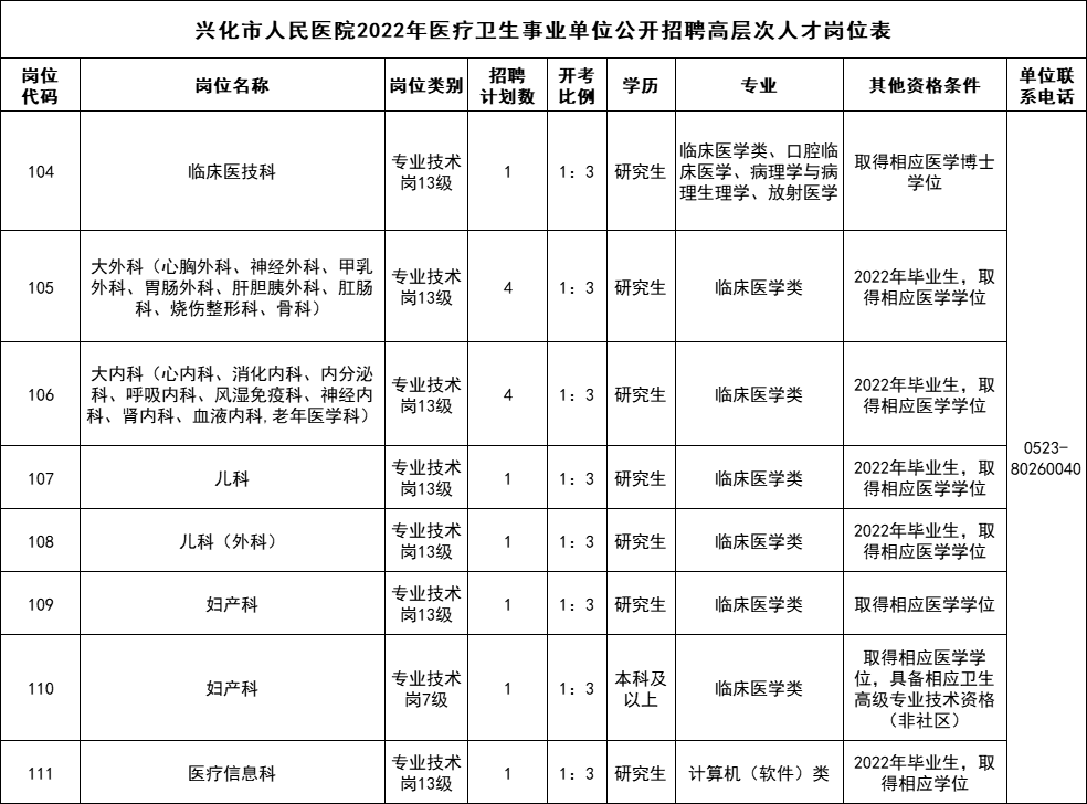 兴化市人民医院 2022 年公开招聘高层次人才公告(全年)