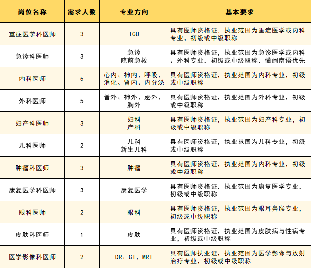 点击岗位名称即可应聘☟☟☟重症医学科医师急诊科医师内科医师外科医师妇产科医师儿科医师康复医学科医师眼科医师医学影像科医师麻醉科医师