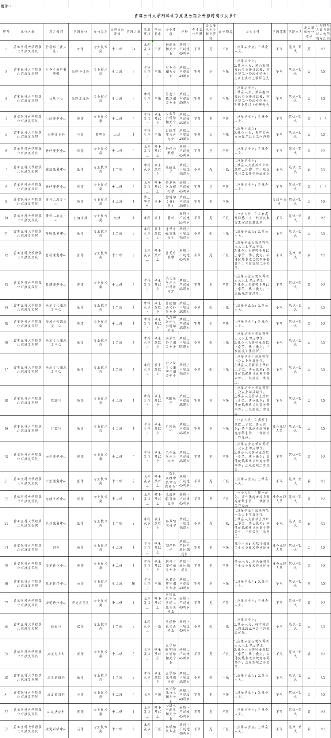 >> 首都医科大学附属北京康复医院招聘岗位及要求