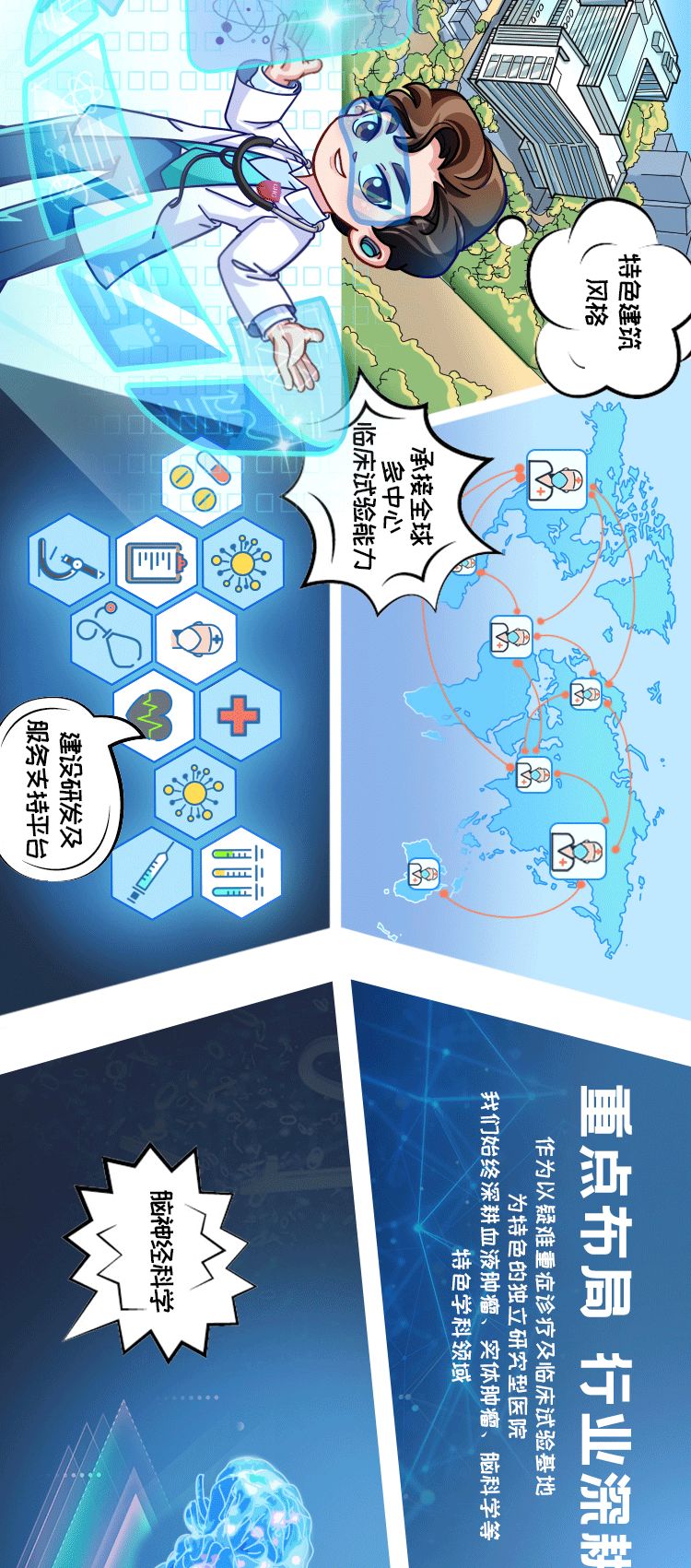 深耕血液病、肿瘤、脑科学等专科领域,业务范围覆盖临床医学诊疗、临床特殊检验、医学影像、基因检测诊断技术、生物制药、医疗信息化等领域。集团成立以来不断推进建设一个具有专业特色,涵盖临床医学、血液病特检、影像医学、基因分子诊断、生物治疗技术的医院连锁机构。