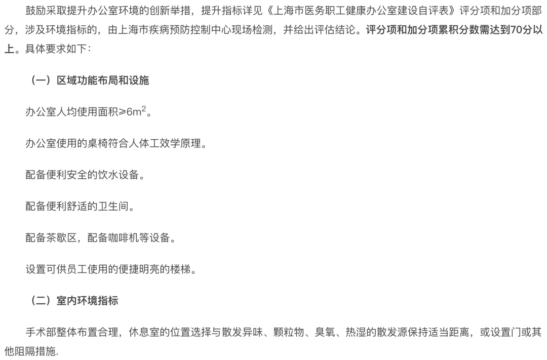 在基本要求上,上海市还鼓励各家医院进一步做好细节,设置了「提升指标」和「加分环节」,如休息室配备咖啡机、按摩椅;办公室配备人体工学桌椅、茶歇区、咖啡机,人均使用面积≥6 平方米等。