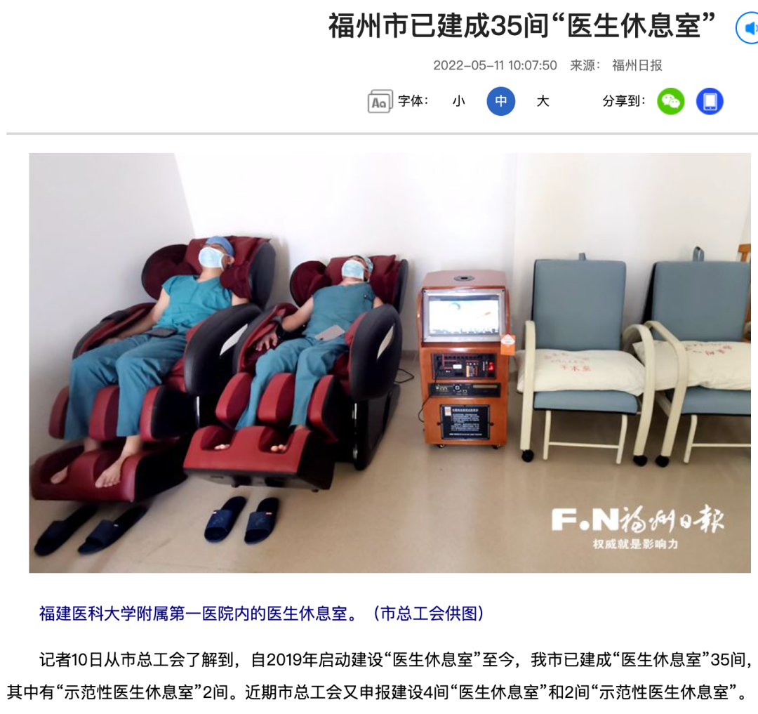近日,福州市总工会的一则新闻发布,让医生标准化休息室、办公室的建设问题回到了医疗界众人的视线。