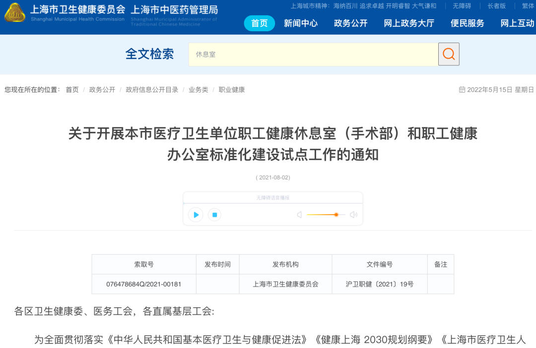 除福州外,上海在 2021 年也曾启动过「医疗卫生单位职工健康休息室(手术部)和职工健康办公室标准化」建设试点工作,并在次年选拔出了 10 家休息室样板间和 10 家职工健康办公室样板间。