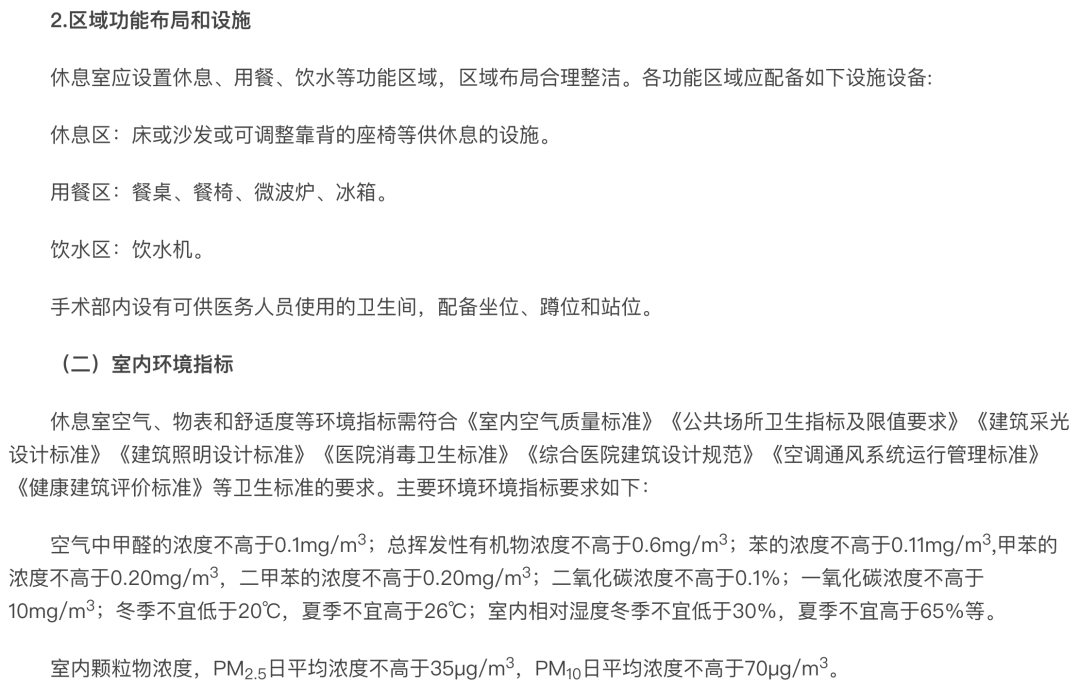 上海的医院手术部休息室和医务职工办公室的建设有着详细的标准,甚至精确到了具体配备的设施和室内环境指标的具体数值。