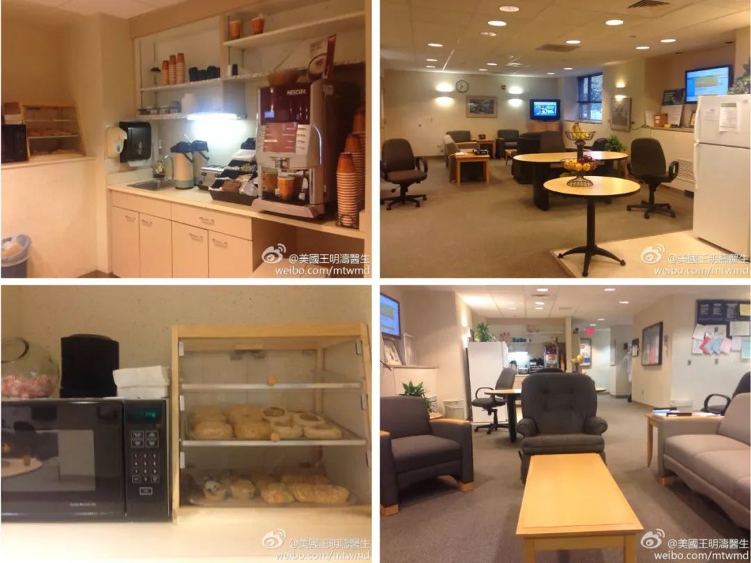 2014 年微博用户「小城王明涛医生」曾分享了自己所在的美国医院的休息室实拍,供应充足的物资、宽敞的空间和完备的设施曾引得评论区众人艳羡。
