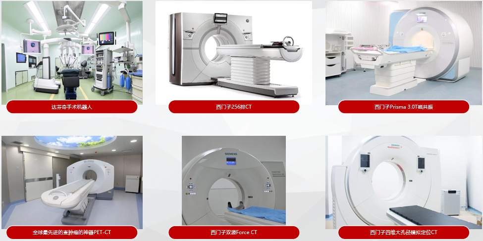 达芬奇手术机器人、 Accuray(安科锐)M6 全数字放射外科-射波刀、西门子 128 排及 256 排 CT、西门子 Prisma 3.0T 磁共振、全球最先进的查肿瘤的神器 PET-CT、西门子双源 Force CT、西门子四维大孔径模拟定位 CT、西门子数字平板胃肠机、GE Optima XR648 高端 DR、瓦里安全新一代 Halcyon 智慧放疗系统、头部伽玛刀、光谱 CT、3D 腹腔镜、超高清腹腔镜和荧光腹腔镜等国际一流医疗设备,设置 3 间数字化手术室,设备总值超 6 亿元。