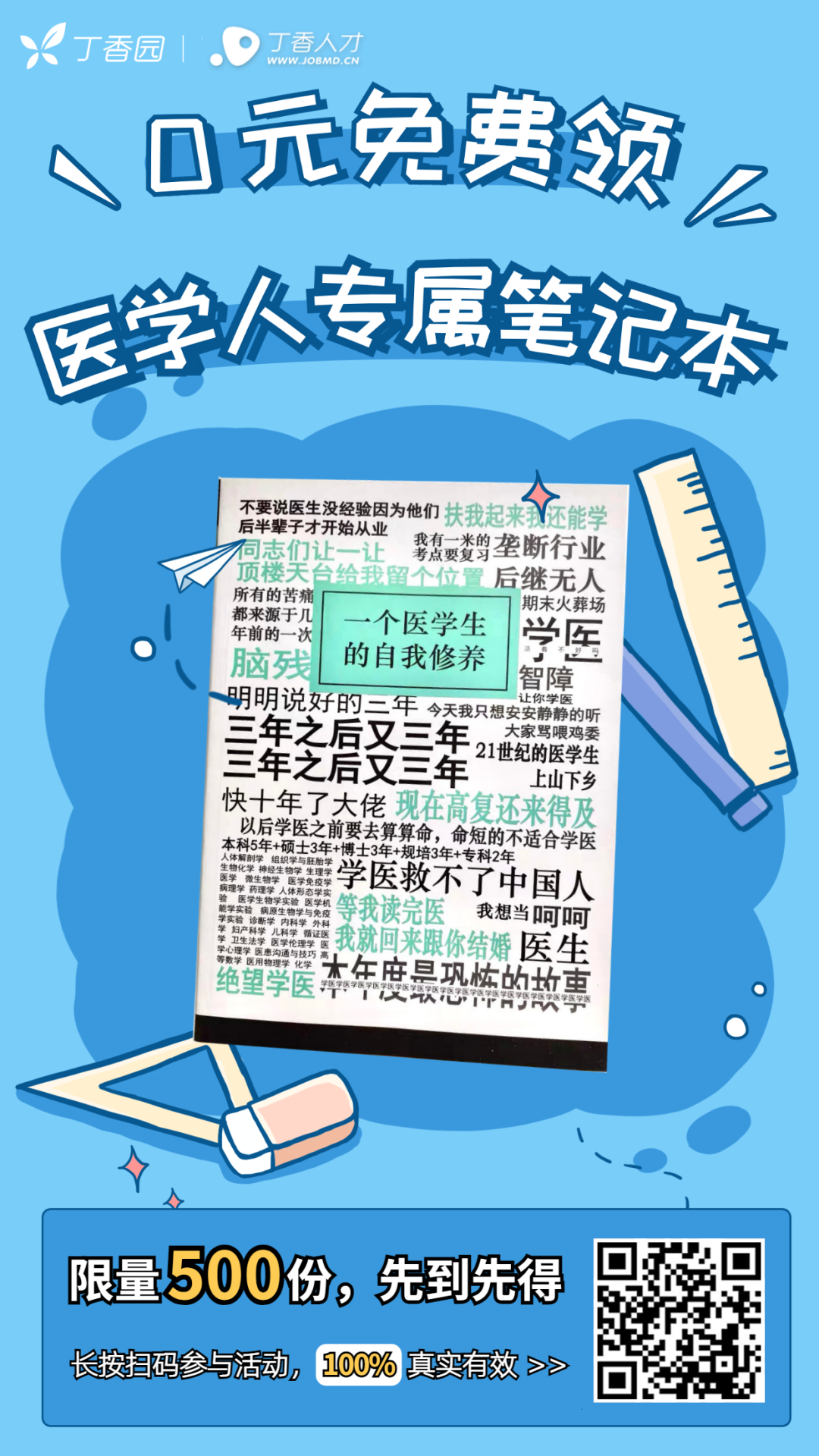 今天, 500 本医学人专属笔记本免费送给大家!一起做低调又坚定的医学人!