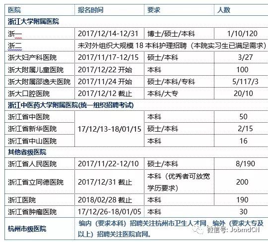 浙江省外或者省内的护理应届生,如果打算毕业后在杭州工作,那么首先要列一下医院名单。杭州三甲医院不胜枚举,了解有哪些医院,进而关注各大医院官网上的人才招聘栏,就可以掌握他们的历年的招聘要求、人数以及招聘的时间、流程。