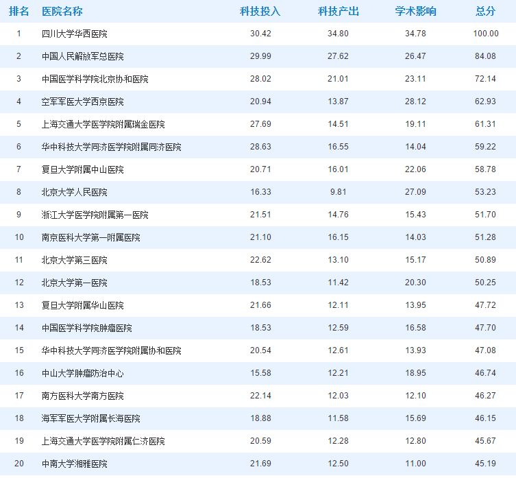 中国医学科学院医学信息研究所发布的 2017 年中国医院科技影响力排行榜(包括科技投入、科技产出、学术影响力三个维度),排行前 100 的医院主要分布在 20 个省份,其中北京、上海、广东分别为 22 个、10 个、9 个;从地区分布角度,东中西部地区分别有 70 个、13 个、17 个。