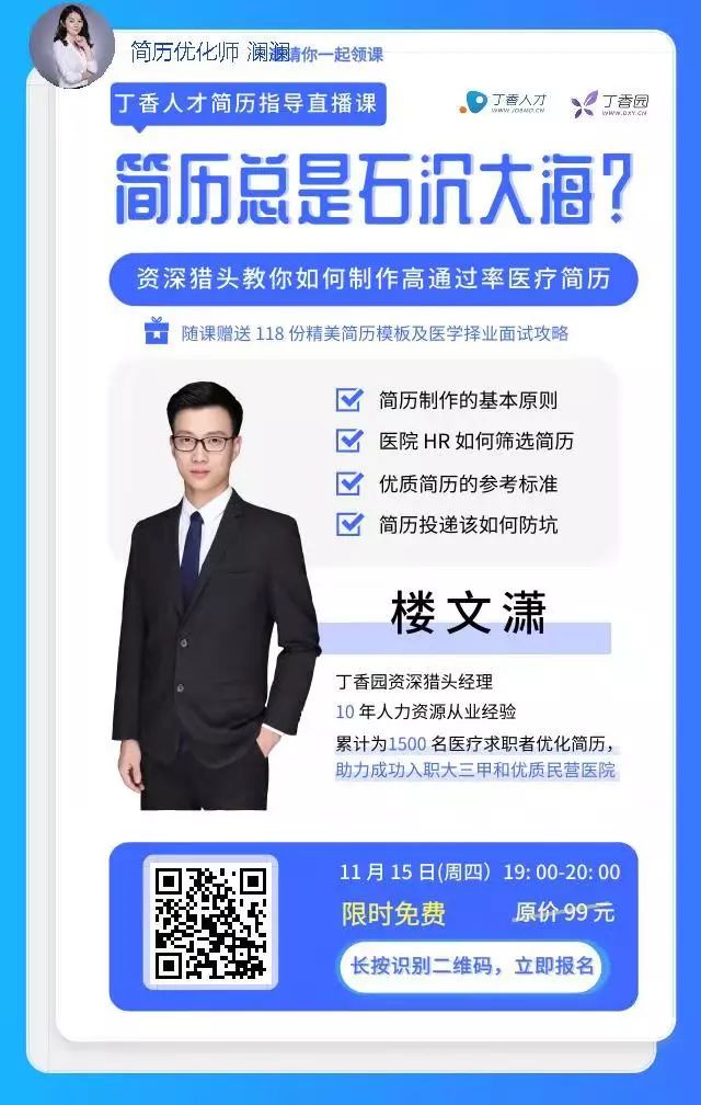 为此,丁香哥哥特别邀请拥有 10 年医疗领域人力资源从业经验的丁香园资深猎头经理楼文潇老师 为大家直播拆解:一份优秀的医疗求职简历,是如何制作的。