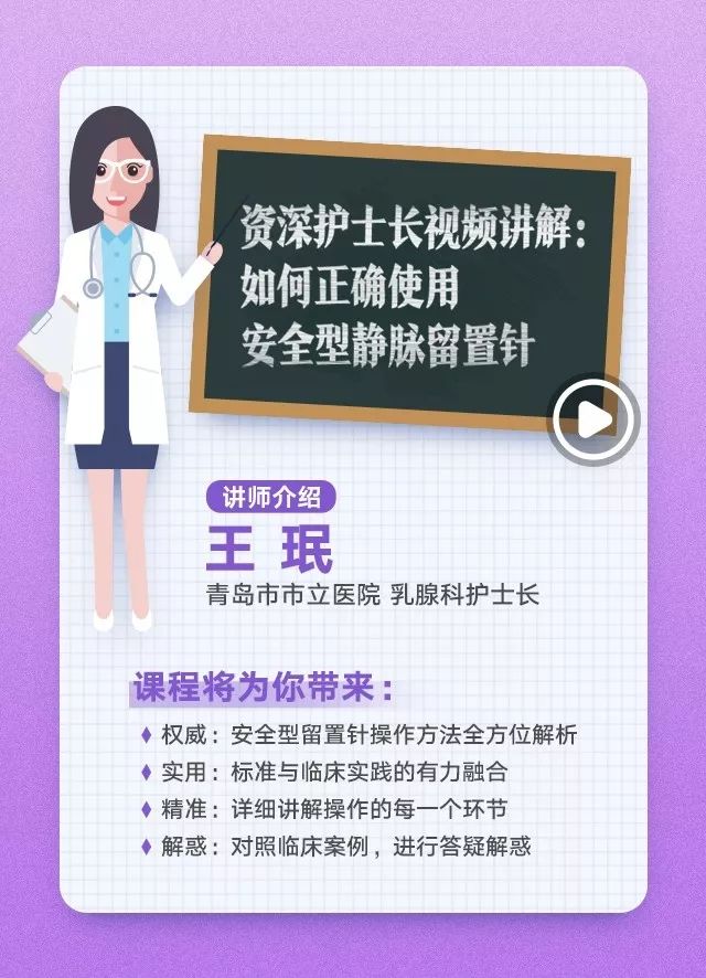 为此,护理时间特邀青岛市市立医院乳腺科护士长、 青岛市静脉输液委员会副主任委员 王珉老师 线上亲授「 如何 正确使用安全型静脉留置针 」视频课。