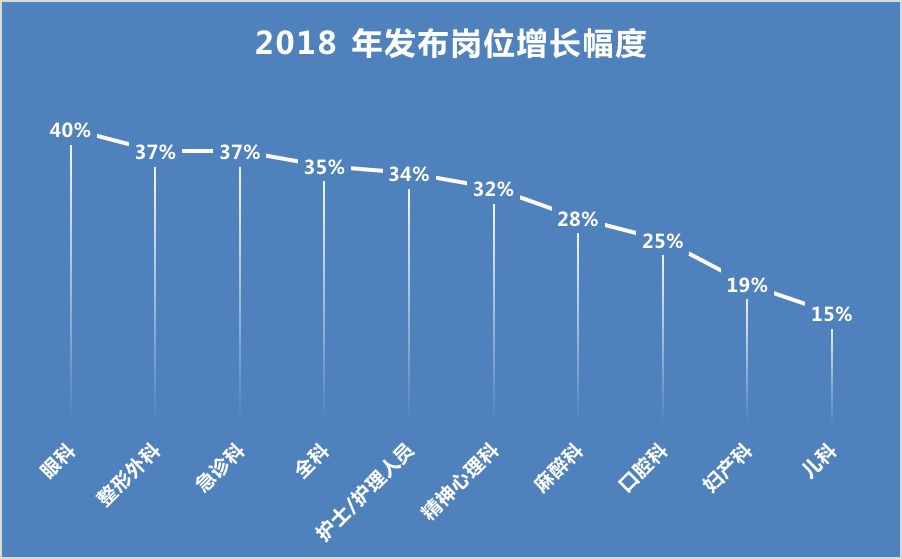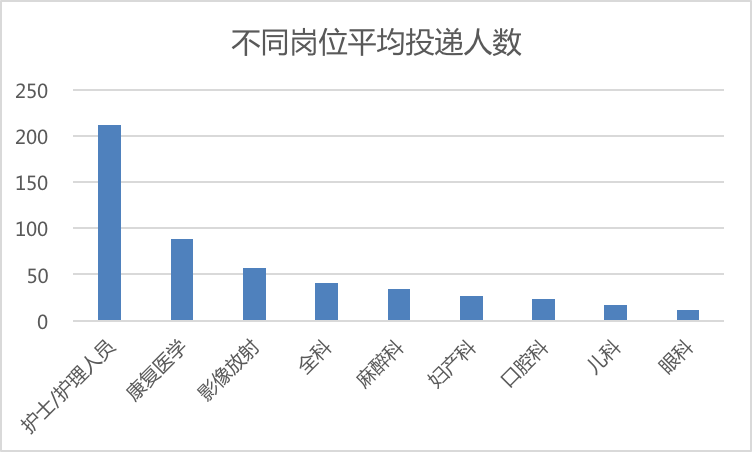 眼科、急诊、全科、口腔、妇产科、儿科市场需求扩大了,因为专业、工作压力、医患关系等原因,这些科室求职意向较低。每个岗位只有 12-15 个人投递,这远远比康复岗位平均 88 个人投递的竞争压力小很多。