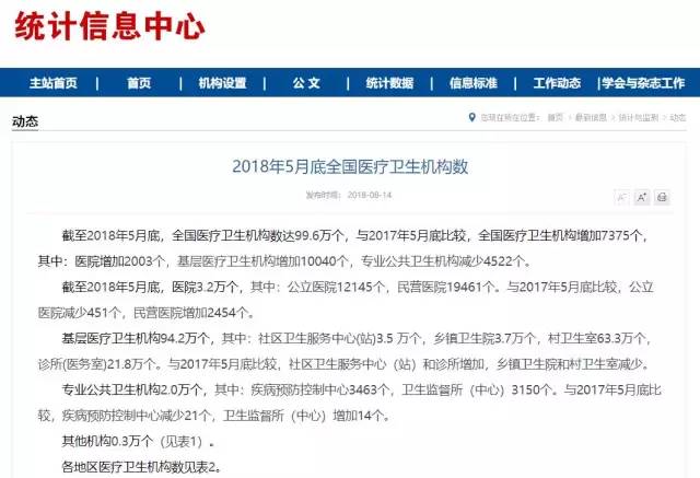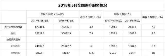 数据显示:截至 2018 年 5 月底,全国医疗卫生机构数达 99.6 万个,与 2017 年 5 月底比较,全国医疗卫生机构增加 7375 个,其中:医院增加 2003 个,基层医疗卫生机构增加 10040 个,专业公共卫生机构减少 4522 个。较去年同期,公立医院减少 451 个,民营医院增加 2454 个。