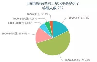 其中,规培工资仅有 1000-2000 元/月的医生高达 52.48%,15.6% 的医生在 2000-3000 元之间,甚至还有 17.7% 规培医师工资在 1000 元以下。
