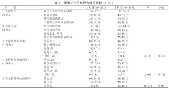 上表显示本科护士大专护士都会经常上网查阅资料,大专生登录的频次反而比本科生高。