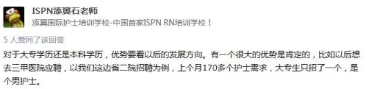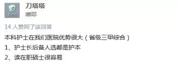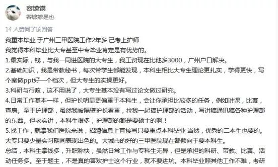 但不得不说,高学历护士已逐渐成为趋势,不仅是本科,硕士、博士研究生护士也大有人在。护士绝不仅仅是打针发药的职业,会越来越专业化,门槛越来越高。大专护士考本科,本科考研究生,在高平台是必然的选择。