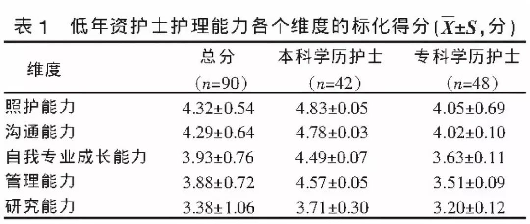 照护能力、沟通能力、自我专业成长能力、管理能力、研究能力数据显示如下: