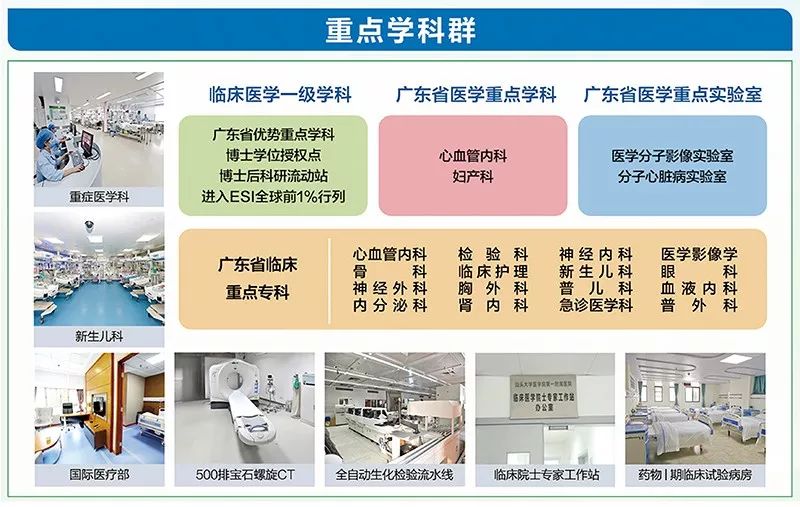 医疗方面 ,临床医学一级学科是广东省优势重点学科,拥有 20 个省级二级和三级重点学科、临床重点专科,医疗仪器设备先进,医疗服务辐射人口达上千万。