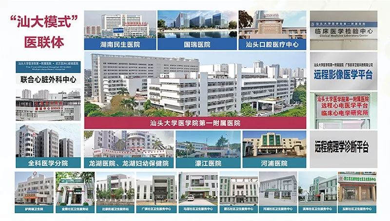医院自 2006 年开始组建汕头大学医学院第一附属医院医联体总医院,由汕大附一院、汕头潮南民生医院、汕大附一院龙湖医院、汕大附一院龙湖妇幼保健院、汕大附一院濠江医院、汕大附一院河浦医院、汕大附一院全科医学分院、汕大附一院心血管病医院、汕头国瑞医院和汕头口腔医疗中心共 10 家医疗机构以及汕头市龙湖区、濠江区以及潮南区共 9 所社区卫生服务中心共同组成,形成以院本部为核心、涵盖一级到三级医疗机构的大型紧密型医联体,涵盖医疗集团、医疗共同体、远程医疗协助网、托管等多种模式。