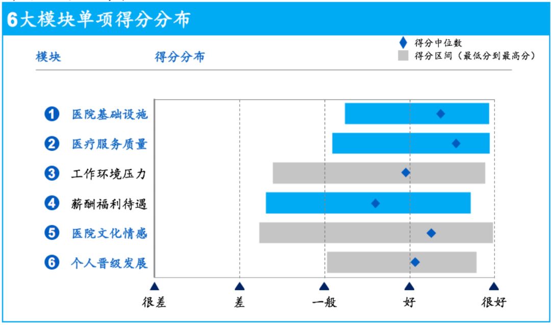 从六大模块的得分区间来看,打分的医务工作者对医疗基础设施、医疗服务质量、个人晋级发展的整体满意度较高,评分都处于「一般」和「很好」之间。