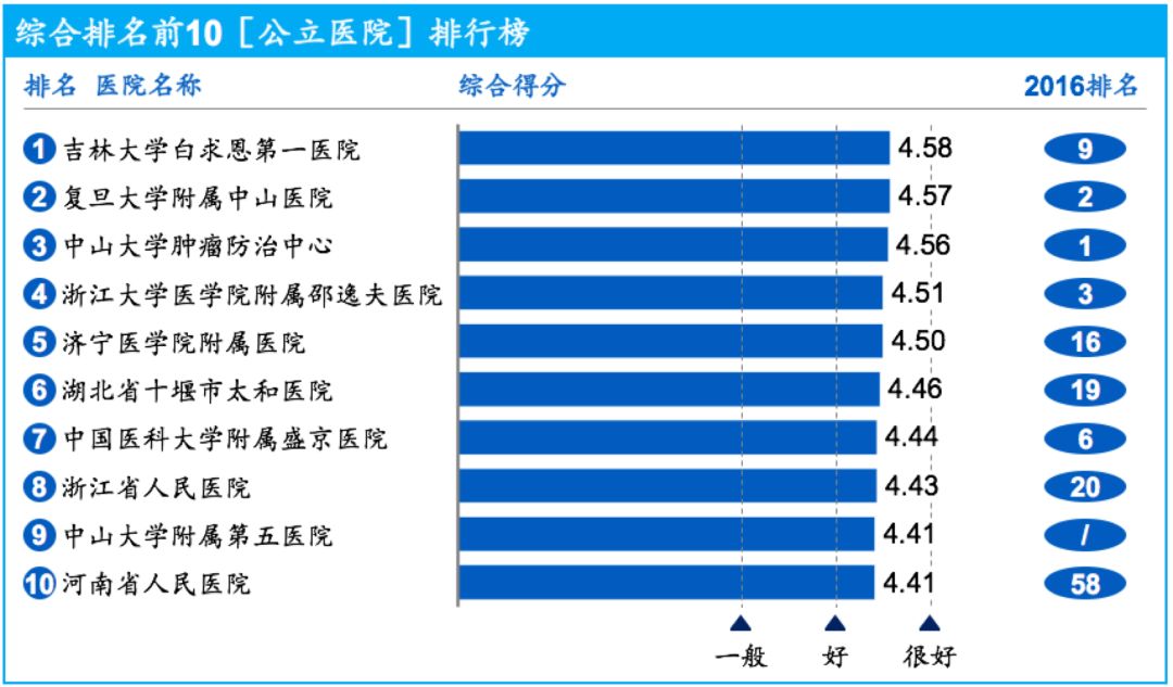 进入综合排名十强的公立医院皆为三级甲等医院,并且其中大部分医院多次进入榜单。吉林大学白求恩第一医院从去年的第 9 名一跃摘得今年公立医院总榜桂冠。另外,河南省人民医院进步显著,从去年的 58 名,成功跻身「2017 年度公立医院最佳雇主」十强。