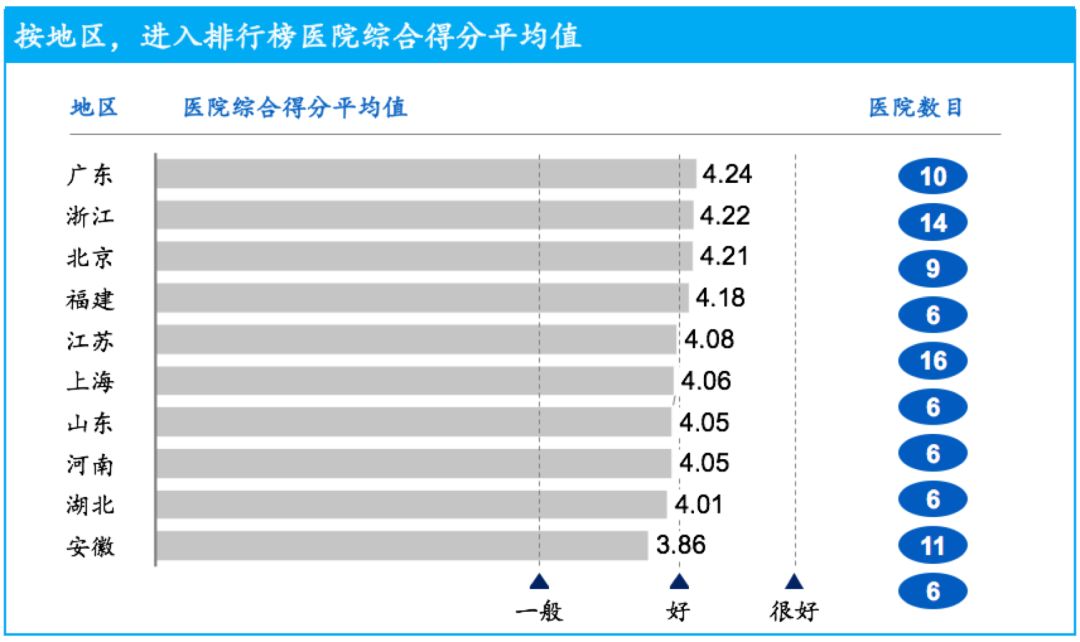 从医院综合得分平均值来看,广东、浙江和北京的医院综合得分名列前茅,得分越高,说明此区域医务工作者对雇主医院的满意度越高。