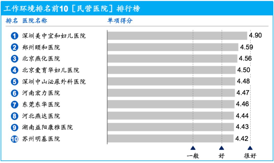 从最佳雇主全国民营医院十强榜单可以看出,深圳美中宜和妇儿医院、湖南益阳康雅医院和郑州颐和医院均以高分分别摘得冠、亚、季军。郑州颐和医院、东莞东华医院以及河南宏力医院连续两年进入十强。