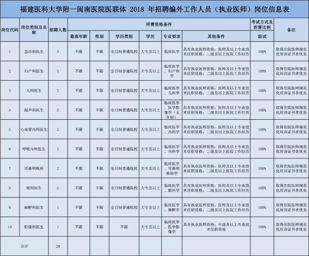 因工作需要,医院拟招聘编外执业医师 20 名,招聘岗位及条件如下: